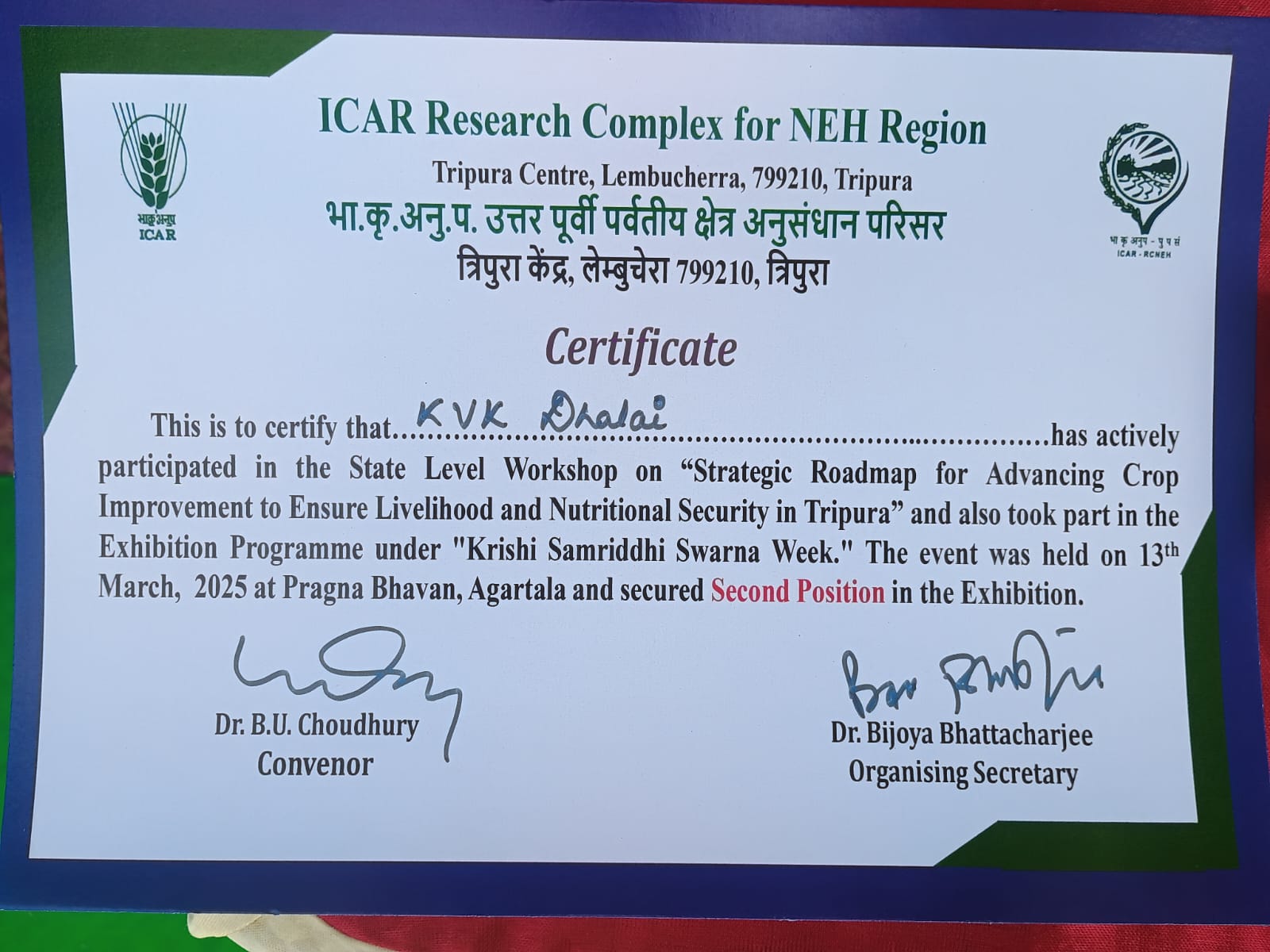 - Paddy varieties Sahbhagi Dhan, CO-51, Tripura Hakuchuk-2, Gomati, Tripura Nirog, Swarna Sub-1, Tripura Chikon Dhan – those varieties are also tested by KVK as per the instruction of ICAR and now most of the varieties are cultivated by farmers.